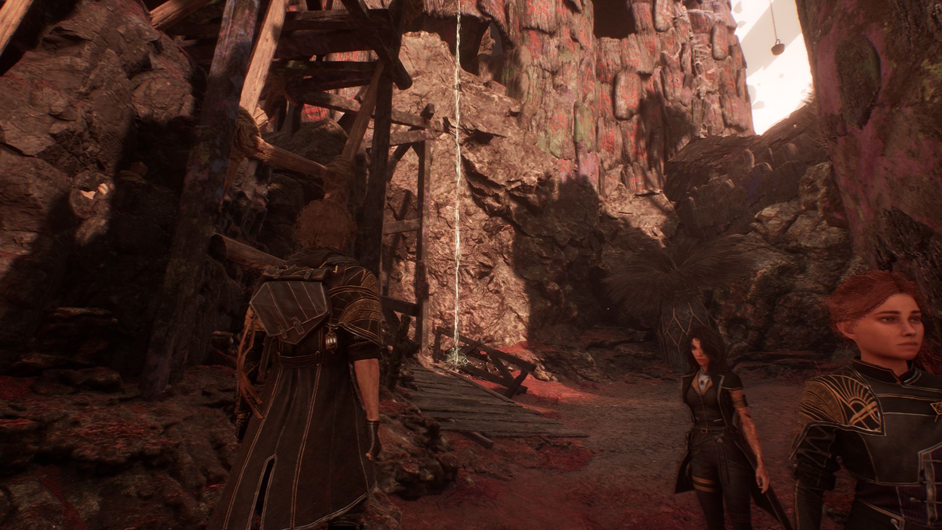 Когда закончите разговаривать с Гольгрой и получите пароль от локации «Гнездо Эскье», вернитесь на арену и повернитесь спиной к флагу экспедиции. Справа заметите разрушенные постройки.
