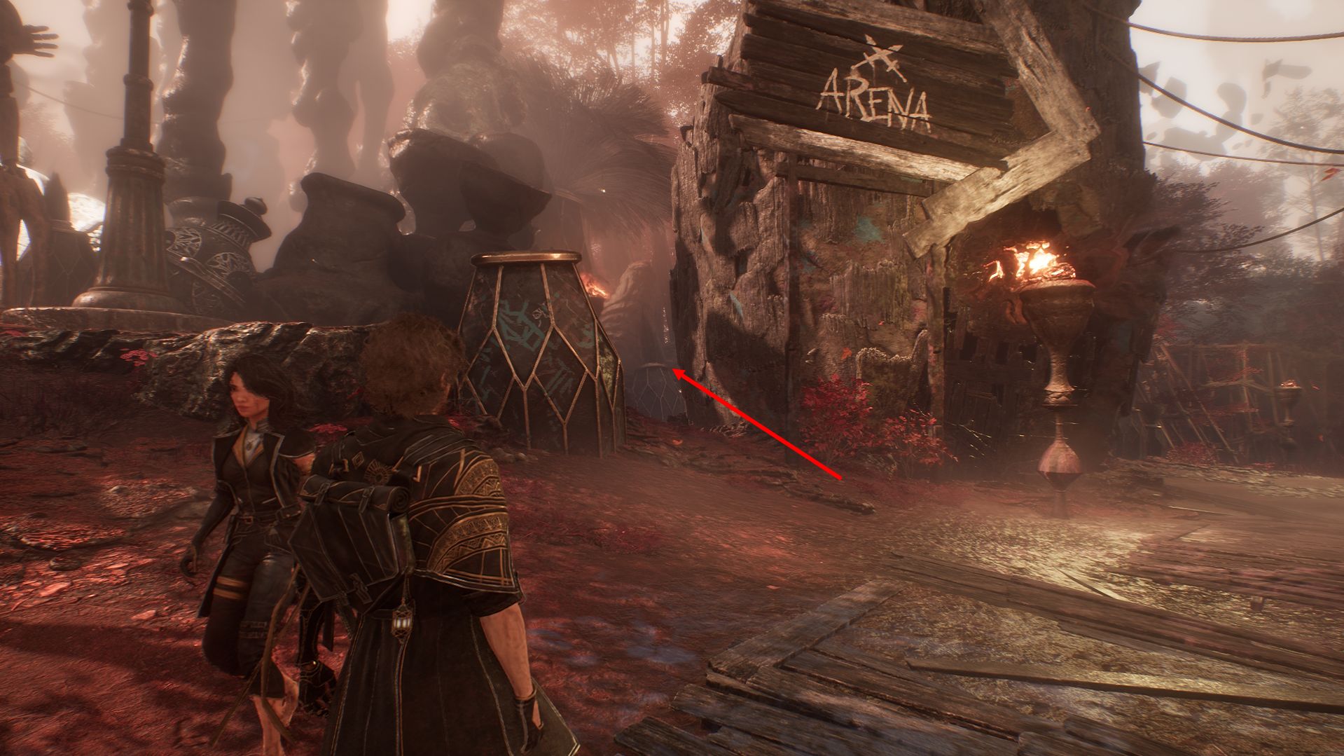 Вернитесь назад к Алексундро и снова пройдите направо по дорожке. Спереди увидите указатель арены. Слева от него есть незаметный проход.