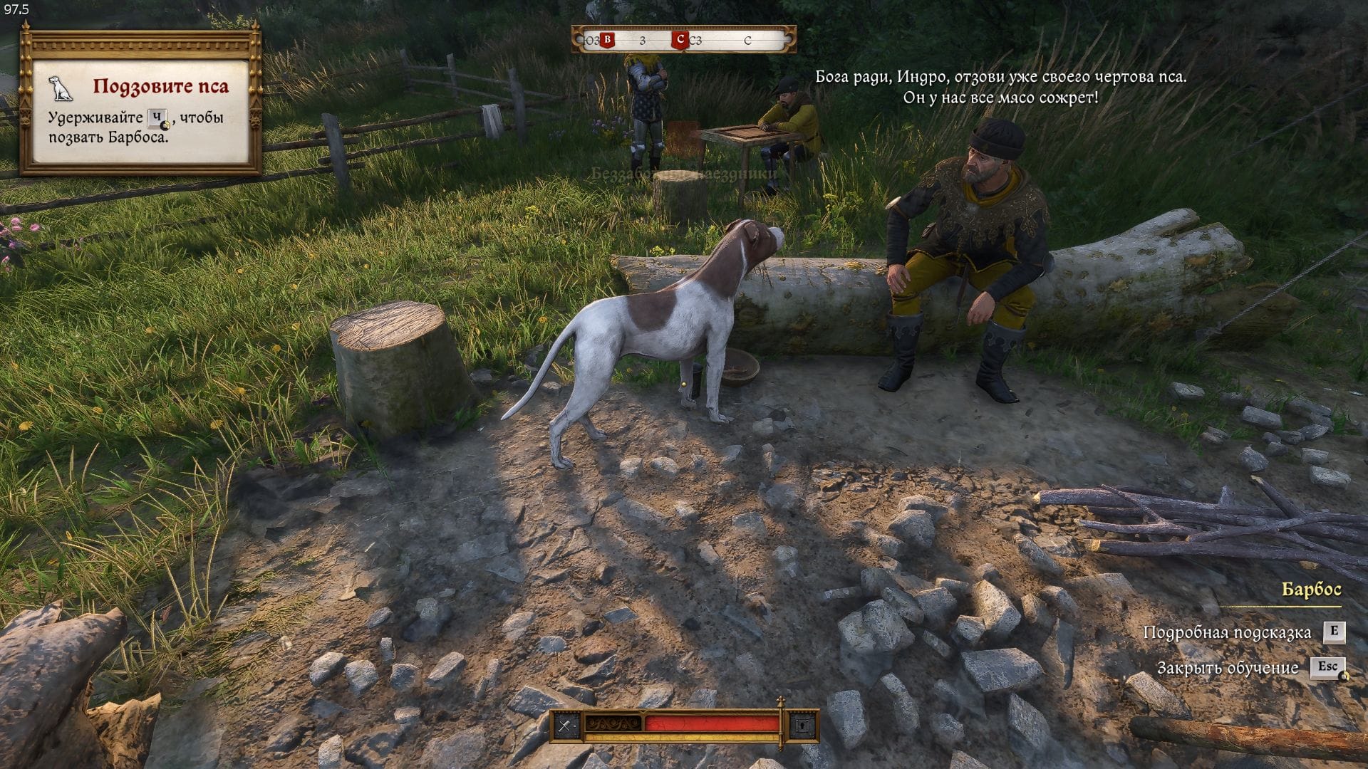 Игра покажет как взаимодействовать с собакой. Барбос будет лаять на нашего товарища, позовите его, зажав соответствующую клавишу (на клавиатуре Ч).