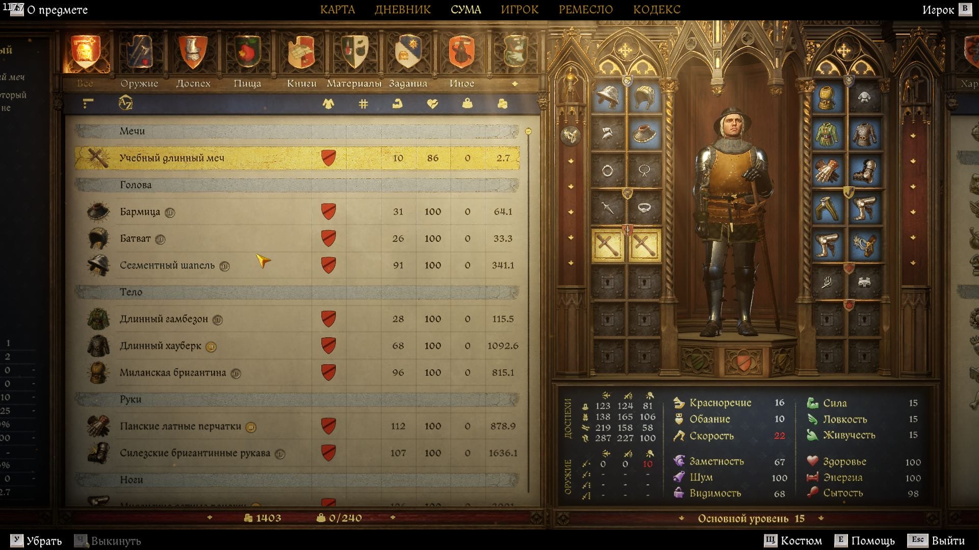Когда разберемся с Вовешем и научимся играть в кости, подходим к Яну. Он предложит провести тренировочный бой — это очередное обучение. Откройте инвентарь и экипируйте всю броню.